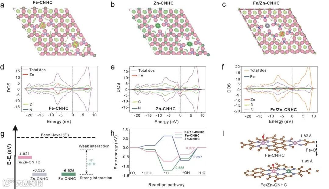 采用先进的物理表征和密度泛函理论(DFT)计算方法对双金属位点Fe/Zn-CNHC的原子分散态、配位结构和电荷密度差进行了表征和测定。FeCo-N8 结构是氧化还原的主要活性中心,相对于传统的单一Fe和Zn中心催化剂,其性能有所改善。