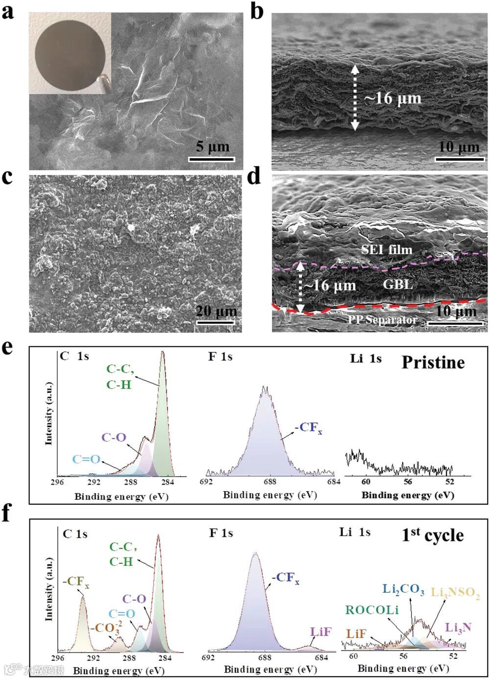 图2. GBL 层的表征及其上形成的 SEI。GBL 俯视图和侧视图的 SEM 图像 a、b) 处于原始状态,c、d) 在第一个循环之后。f) 原始状态和 g) 第一个循环后 GBL 夹层的 C1s、F1s 和 Li 1s 的 XPS分析。