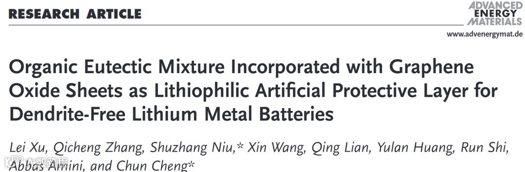 基于此,来自南方科技大学的程春教授与深圳技术大学的牛树章助理教授合作,在国际知名期刊Advanced Energy Materials上发表题为“Organic Eutectic Mixture Incorporated with Graphene Oxide Sheets as Lithiophilic Artificial Protective Layer for Dendrite-Free Lithium Metal Batteries”的研究文章。