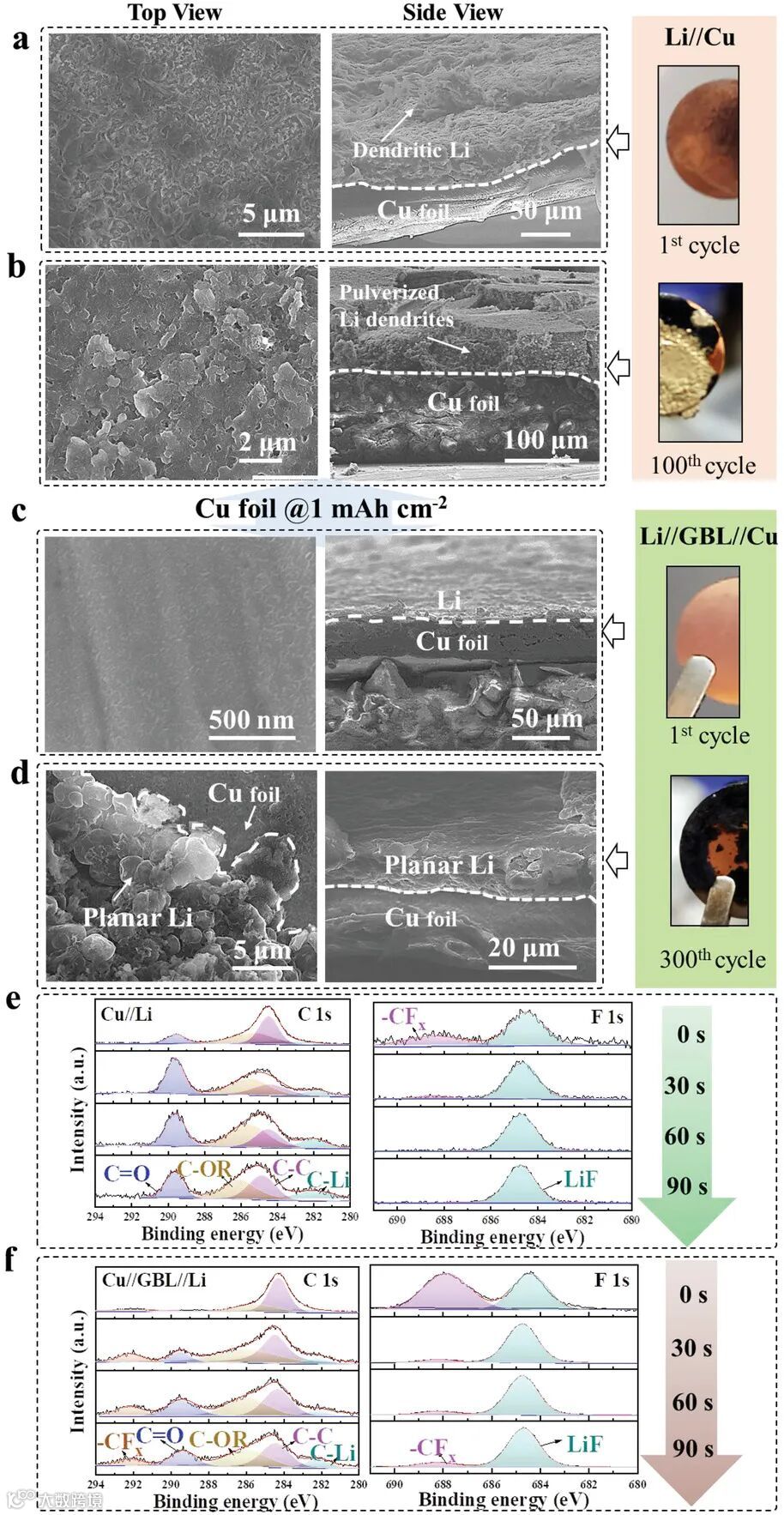 由于 Cu 的疏锂特性和不均匀多孔隔膜引起的不受控制的锂离子通量,Li 不均匀地成核并沉积在Cu集流体的表面上。这导致长循环后形成锂枝晶和死锂(图5a ),不连续的 SEI 和刺穿的 PP 隔膜以及枝晶 Li 的粉碎。而引入GBL夹层后,由于 GBL 提供的 LiTFSI 分解,在 GBL 和 Cu 箔表面构建了致密且富含 LiF 的 SEI 膜。
