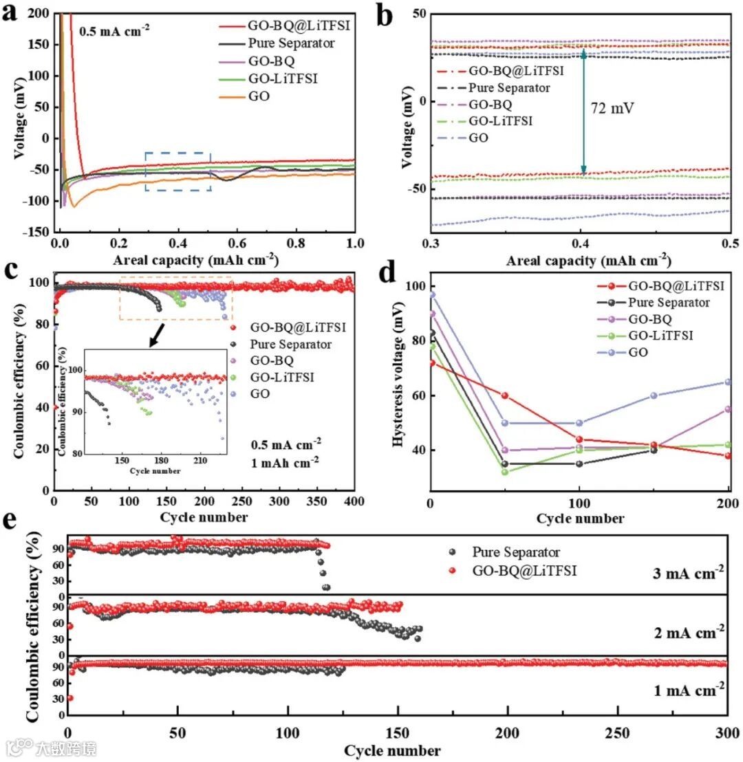 图4. Li||GBL||Cu 和对照半电池的电化学性能。a) Li 成核过电势,b) 剥离和电镀过电势,c) 库仑效率 (CE) 和 d) 由 GBL、GO-BQ、GO-LiTFSI、GO 修饰的电池的相应滞后电压曲线的电压曲线比较, 容量为1 mAh cm -2,电流密度为0.5 mA cm -2的PP隔膜。e) 使用GBL和纯PP隔膜的半电池在不同电流密度和1 mAh cm -2容量下的CE比较。