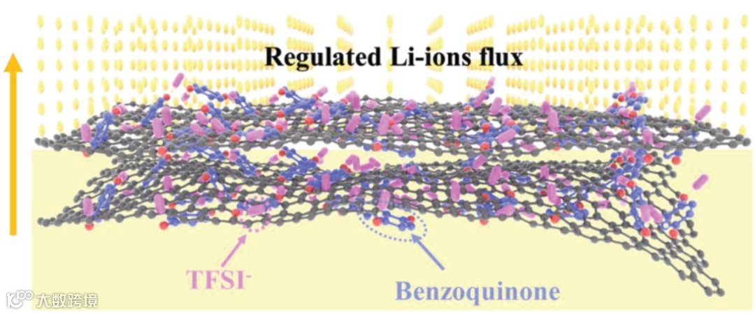 图1. GO-BQ@LiTFSI(GBL)人工保护层示意图(黄色箭头表示锂离子的流动方向)