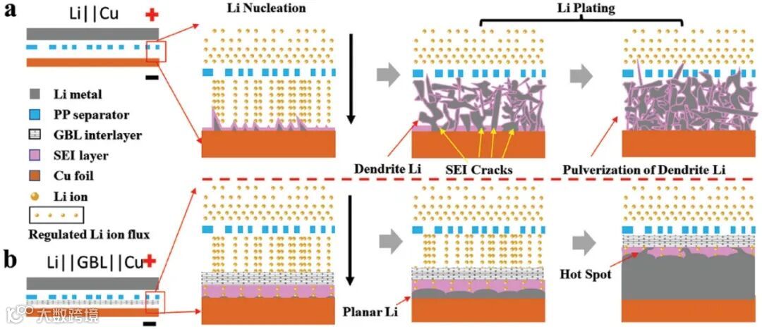 图5. (a) Li||Cu 和 b) Li||GBL||Cu LMB 中锂枝晶生长的示意图(侧视图)。