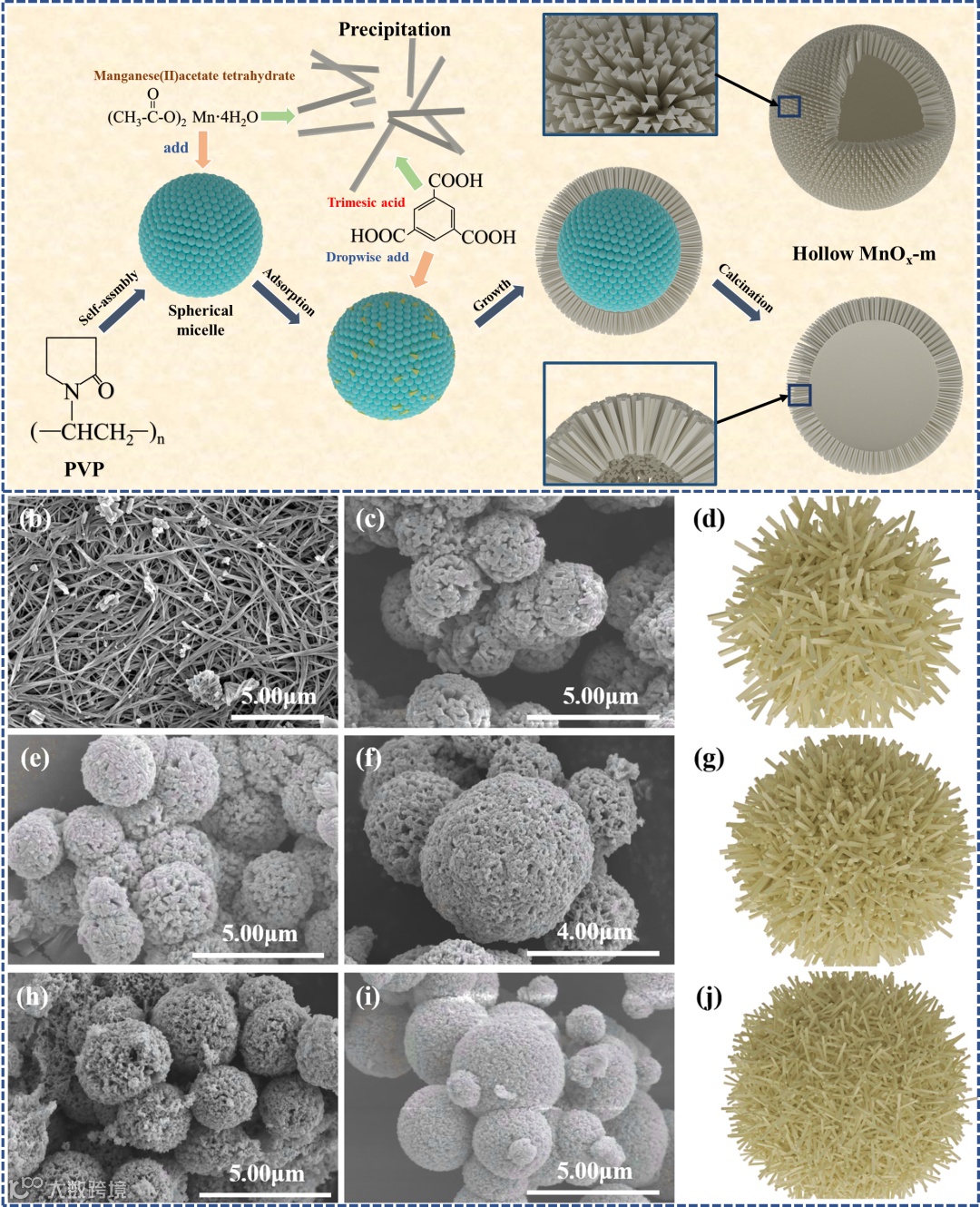 结合表面活性剂(PVP)辅助Mn-BTCs纳米棒原位组装和牺牲模板策略,合成了一系列具有不同表面密集程度的中空结构MnOx微球。醋酸锰、配体与PVP分子组成的球形胶束表面的基团配位,形成的一维Mn-BTCs纳米棒逐渐外延生长,并通过自组装过程紧密交错成三维中空Mn-BTCs微球。由于胶束表面限制效应,一维纳米棒倾向于垂直于空心球形胶束表面,且通过煅烧处理去除配体和PVP后,结构保持不变。此外,优化该策略的PVP用量能够调整Mn-BTCs衍生物表面密集程度和腔体尺寸。