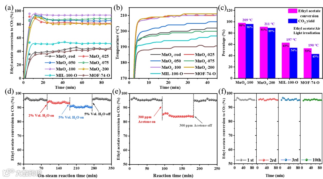 Fig. 3. (a) Photothermal ethyl acetate degradation to CO2 (CO2 yield) with different MOFs-derived catalysts under light irradiation at 480 mW/cm2 (λ > 420 nm) and (b) the related light-induced temperature curves. (c) Ethyl acetate conversion and CO2 yield over the typical MnOx-100, MnOx-200, MIL-100-O and MOF-74-O catalysts, and the effects of (d) water vapor and (e) 300 ppm acetone on ethyl acetate conversion to CO2 and (f) stability test over MnOx-100 catalyst.