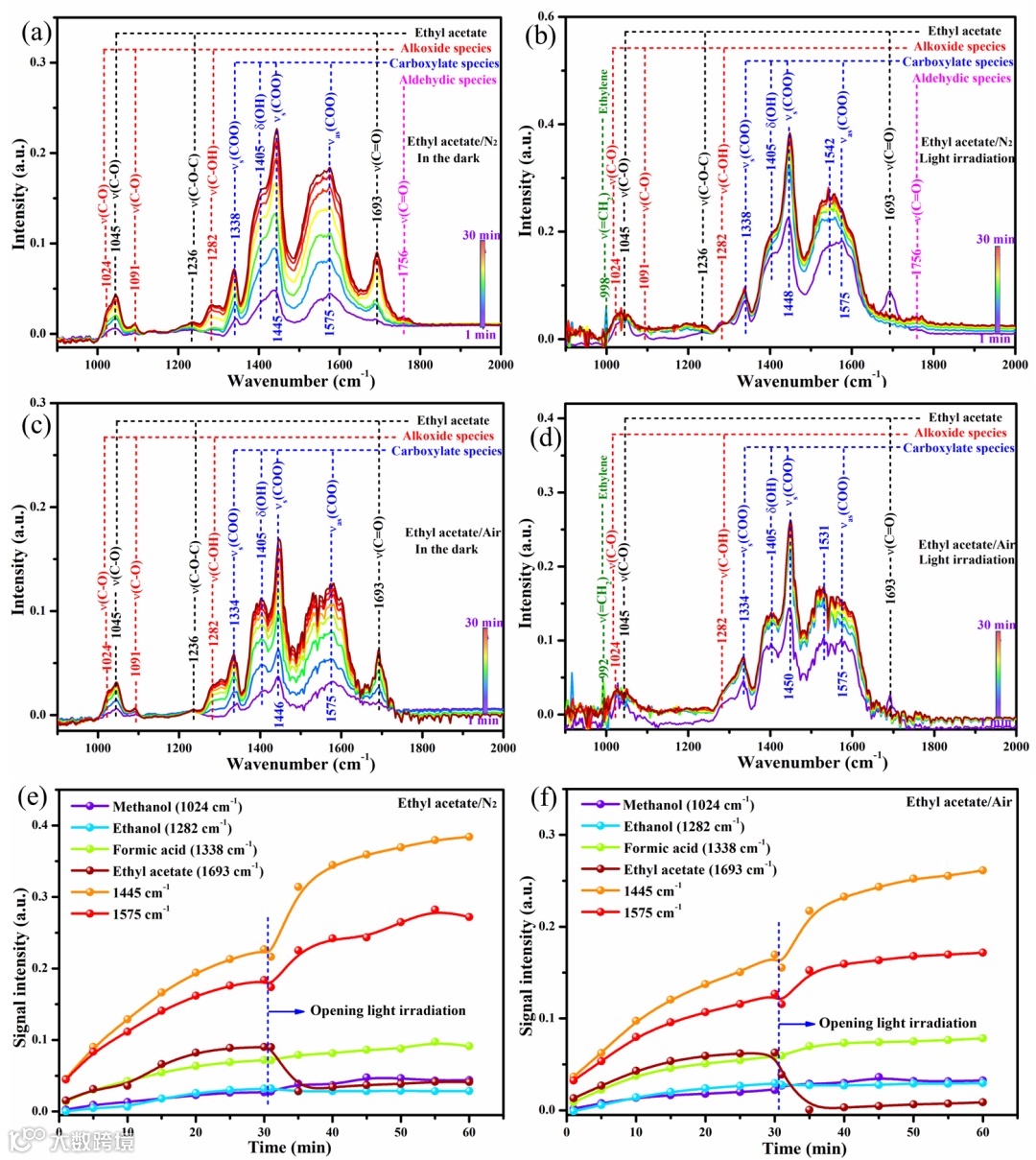 Fig. 6. In situ DRIFTS spectra of ethyl acetate oxidation as a function of time exposed to 500 ppm ethyl acetate/N2 under the (a) dark and (b) light irradiation, as well as 500 ppm ethyl acetate/air atmosphere under the (c) dark and (d) light irradiation over the MnOx-100 catalyst. (e, f) Plots of signal intensities of surface organic species involving methanol (~1024 cm−1), ethanol (~1282 cm−1), formic acid (~1338 cm−1),ethyl acetate (~1693 cm−1) and carboxylate species (~1445 and ~1575 cm−1) versus time under different atmosphere.