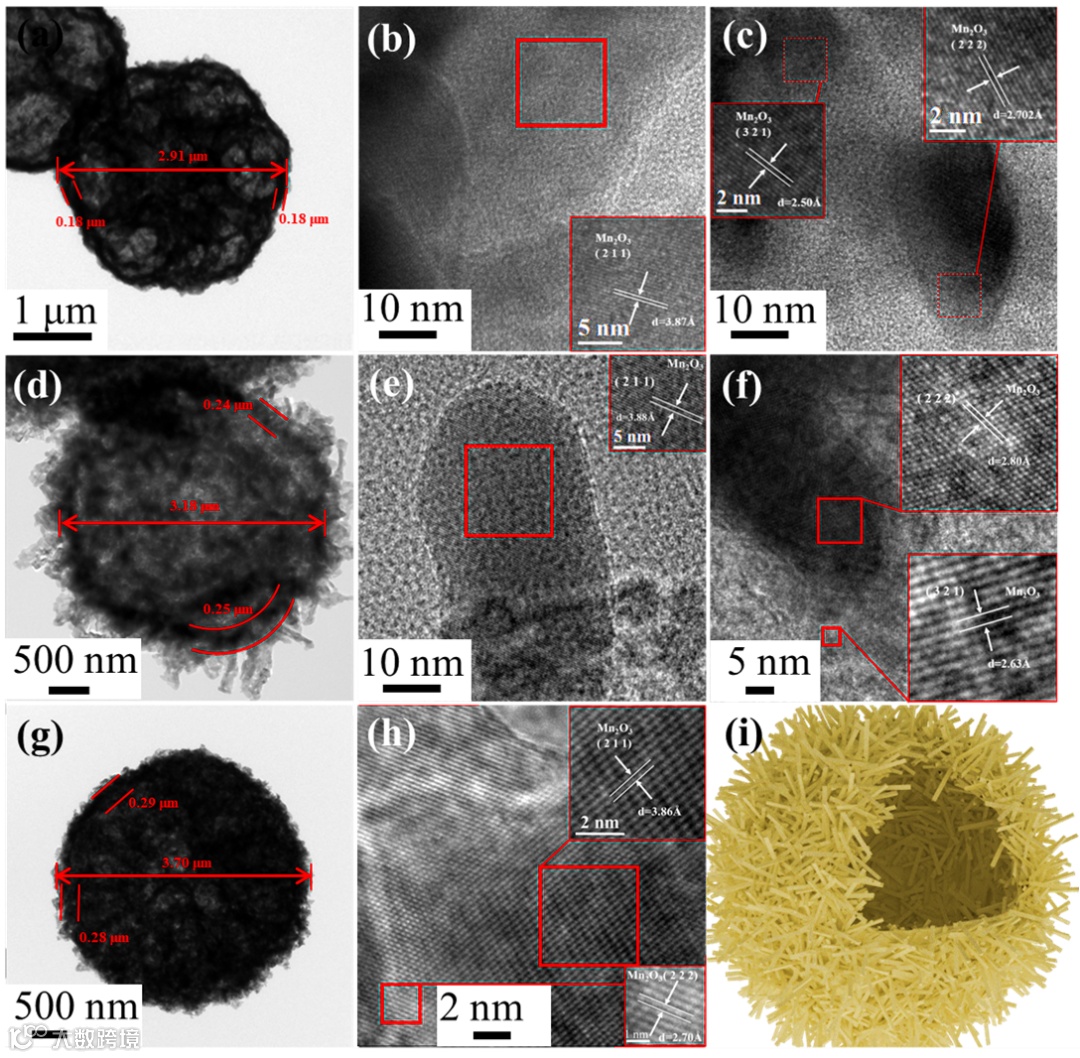 Fig. 2. TEM images of microspheres with different levels of surface assembly density, (a) MnOx-050, (d) MnOx-100 and (g) MnOx-200, the corresponding HRTEM images of (b, c) MnOx-050, (e, f) MnOx-100 and (h) MnOx-200. (i) Schematic diagram of model on the hollow microsphere assembled from nanorods.