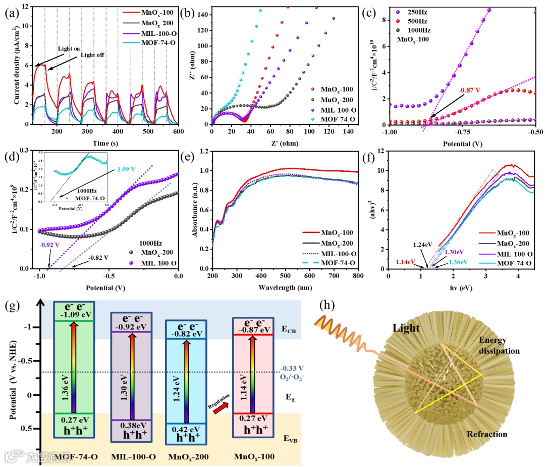 Fig. 4. (a) Transient photocurrent responses to light on/off under light irradiation (λ > 420 nm) and (b) electrochemical impedance spectroscopy (EIS) Nyquist plots of different MOFs derivatives. Mott-Schottky curves of (c) MnOx-100, (d) MnOx-200 and MIL-100-O. (e) UV-Vis diffuse reflectance spectra, (f) related tauc plots profiles and (g) energy band diagrams of MnOx-100, MnOx-200, MIL-100-O and MOF-74-O, and (h) the schematic diagram of light scattering and reflection effect inside hollow structure.