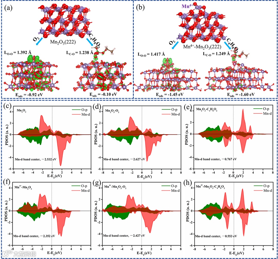 Fig. 5. The simulated models, adsorption energies (Eads), bond distances (LO-O and LC-O) and charge density differences (the green and red isosurfaces are charge accumulation and depletion in the space, respectively) of O2 and ethyl acetate adsorption on the (a) Mn2O3(222) and (b) Mn4+-Mn2O3(222) surfaces. Projected density of state (PDOS) profiles for (c-e) Mn2O3(222) and (f-h) Mn4+-Mn2O3(222) models at before and after O2 and ethyl acetate adsorption.