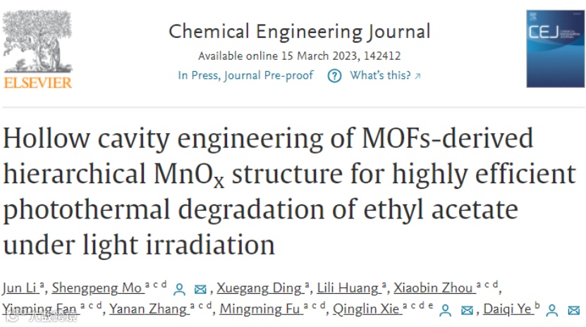 基于此,桂林理工大学的解庆林教授、莫胜鹏副教授与华南理工大学的叶代启教授合作,在国际知名期刊Chemical Engineering Journal上发表题为“Hollow cavity engineering of MOFs-derived hierarchical MnOx structure for highly efficient photothermal degradation of ethyl acetate under light irradiation”的研究文章。