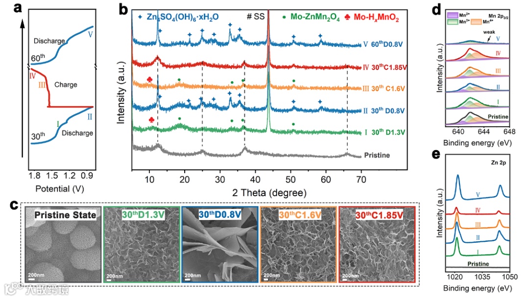 对不同充放电状态的Mo-MnO2正极进行XRD、XPS和SEM测试以分析其储能机理。结果表明,经一定圈数的电化学活化,Mo-MnO2可通过锌离子和氢离子的共同脱嵌来诱发不稳定的Mo-ZnMn2O4和Mo-HxMnO2中间相可逆的转变为Mn2+并完全溶解于电解液中。该电池稳定循环一段时间后容量开始衰减,应该归结于Mo掺杂在Mn-O层板的溶出现象。