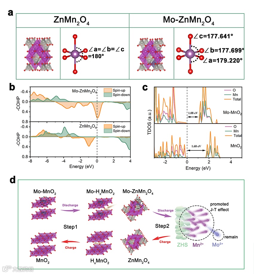 Mo掺杂使得而Mo-ZnMn2O4的键角发生一定的扭曲,进而加剧[MnO6]八面体的结构畸变。此外,Mo-ZnMn2O4在费米能级处出峰,再次确认Mo5+会促进其可逆发生Mn4+/Mn2+两电子转移反应。Mo-MnO2较窄的TDOS带隙表明Mo掺杂显著提高Mo-MnO2的导电率和离子传输。因此,Mo掺杂所引起的亚稳中间体结构和高电导率可协同助力高能量密度和快反应动力学的水系锌锰电池。