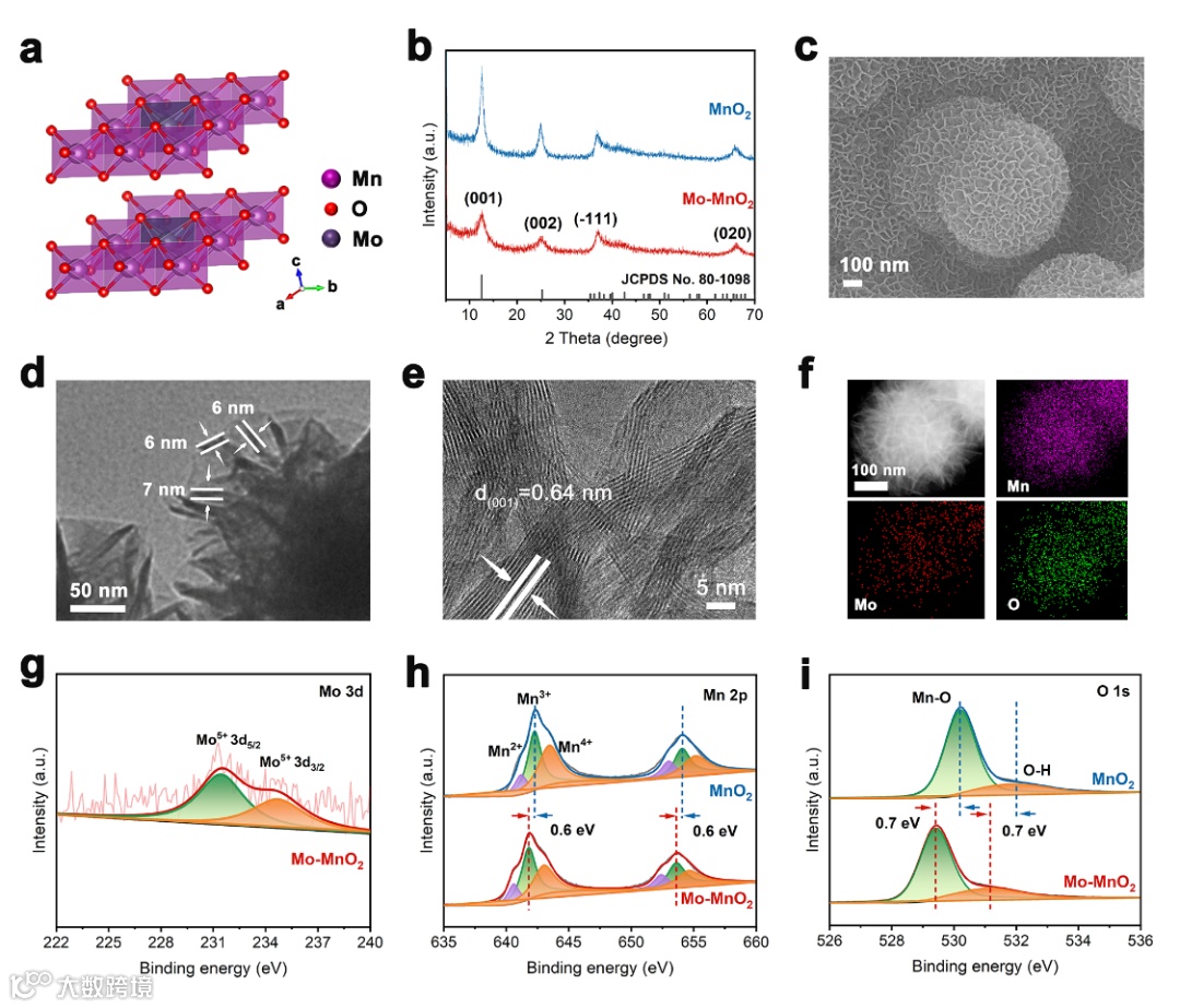 本工作通过一步水热法制备纳米花状Mo-MnO2。结合XRD、SEM-EDS、XPS和HRTEM发现Mo5+掺杂主要以Mo-O-Mn的结合方式均匀分布于Mn-O层板,且未改变δ-MnO2的层状结构。