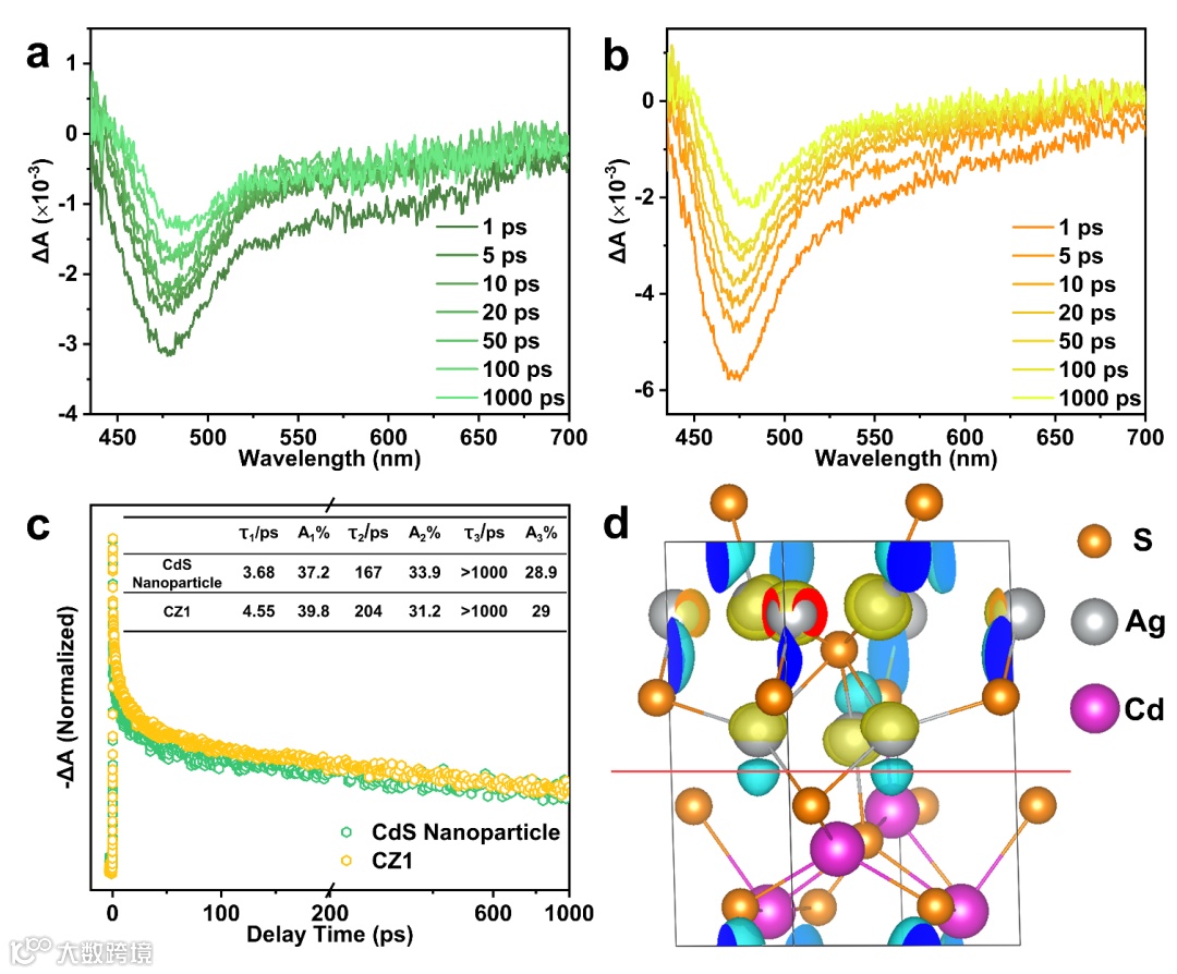 Figure 5. Transient absorption spectra of (a) CdS Nanoparticle and (b) CZ1 under 400 nm excitation. (c) Transient absorption decay kinetics of CdS Nanoparticle and CZ1 at 475 nm (the inserted table shows the fitted data). (d) Charge-density-difference maps between CdS and Ag2S.