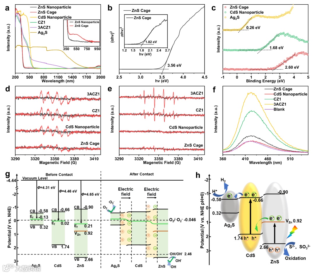 Figure 4. (a) UV-Vis-NIR absorbance spectra, (b) the (αhν)2 vs. hν curve of ZnS Cage and (c) valence band XPS. Electron spin resonance (ESR) spectra of (d) 5,5-dimethyl-1-pyrroline N-oxide (DMPO)-·O2- and (e) DMPO-·OH (the black line is measured without light, and the red line is measured after 3 min of visible light exposure). (f) The ·OH trapping PL spectra with terephthalic acid (TA) solution (λex=315 nm). (g) Energy band alignments before and after contact in 3ACZ1. (h) Diagram of the PHE mechanism of 3ACZ1 photocatalyst under visible light irradiation.
