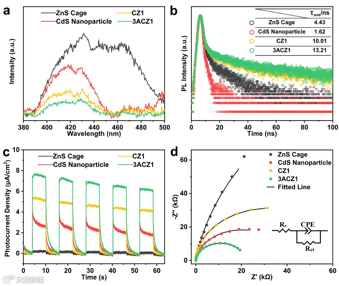 Figure 3. (a) Photoluminescence (PL) spectra and (b) Time-resolved PL spectra (the insert table are the corresponding average fluorescence lifetimes). (c) Transient photocurrent density under visible light (420 nm<λ<800 nm) illumination and (d) Electrochemical impedance spectra (EIS) under visible light illumination conditions (the insert is the equivalent circuit used to fit the data).