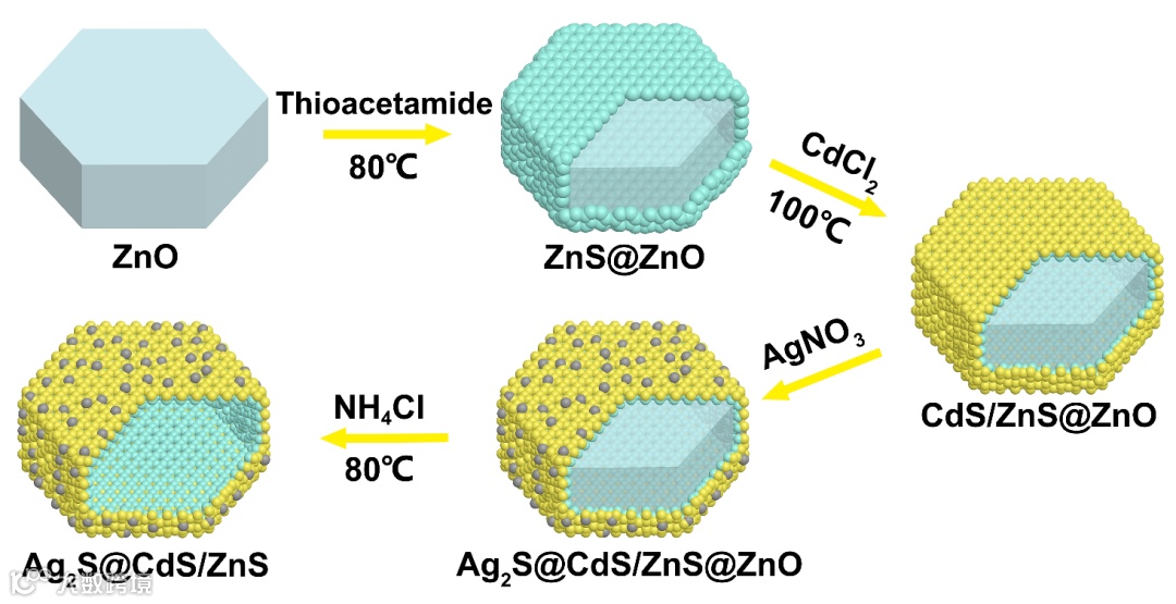 Figure 1. An illustration of the preparation of Ag2S@CdS/ZnS (ACZ) photocatalyst. ZnO hexagonal template decomposed with thioacetamide to form a ZnS layer on the surface. After the ion exchange of Cd2+ of CdCl2, a CdS layer is form on the surface and inheriting cage-like structure. By adding AgNO3, the ion exchange of Cd2+ and Ag+ occurred at the outermost side. The internal ZnO was removed by NH4+ etching.