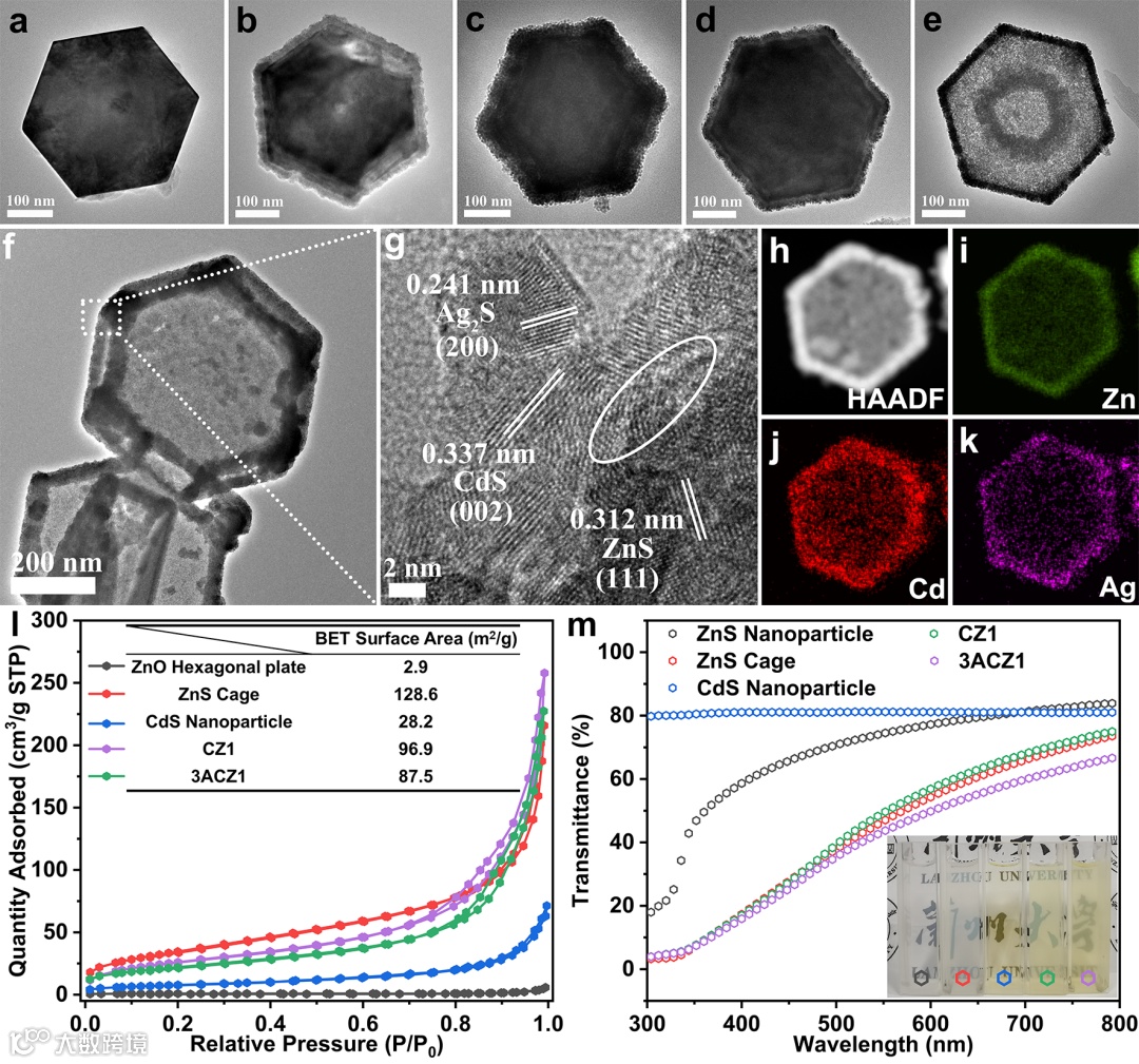 以ZnO六角片作为初始模板,首先通过硫化过程在其表面形成ZnS壳层,随后通过Cd2+离子和Ag+交换过程依次沉积CdS和Ag2S,最后利用NH4+将ZnO模板去除,得到具有笼状结构的Ag2S@CdS/ZnS复合光催化剂(图2a-e)。空心结构使3ACZ1的比表面积提高至87.5 m2/g(图2l),而且相同浓度下悬浊液的透光率明显降低,有效增强了材料的光捕集效率(图2m)。