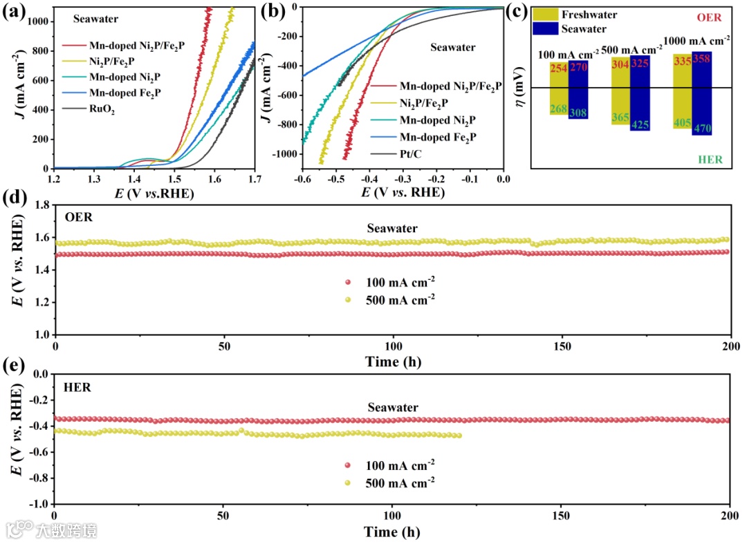 Mn-doped Ni2P/Fe2P 在碱性淡水中获得1000 mA cm-2的析氧和析氢电流密度,分别仅需335和405 mV的过电势;在碱性海水中获得1000 mA cm-2的析氧和析氢电流密度,分别仅需358和470 mV的过电势,表现出了优异的电解水双功能活性。此外,Mn-doped Ni2P/Fe2P 在碱性海水的500 mA cm-2的高析氧电流密度下稳定运行200小时。