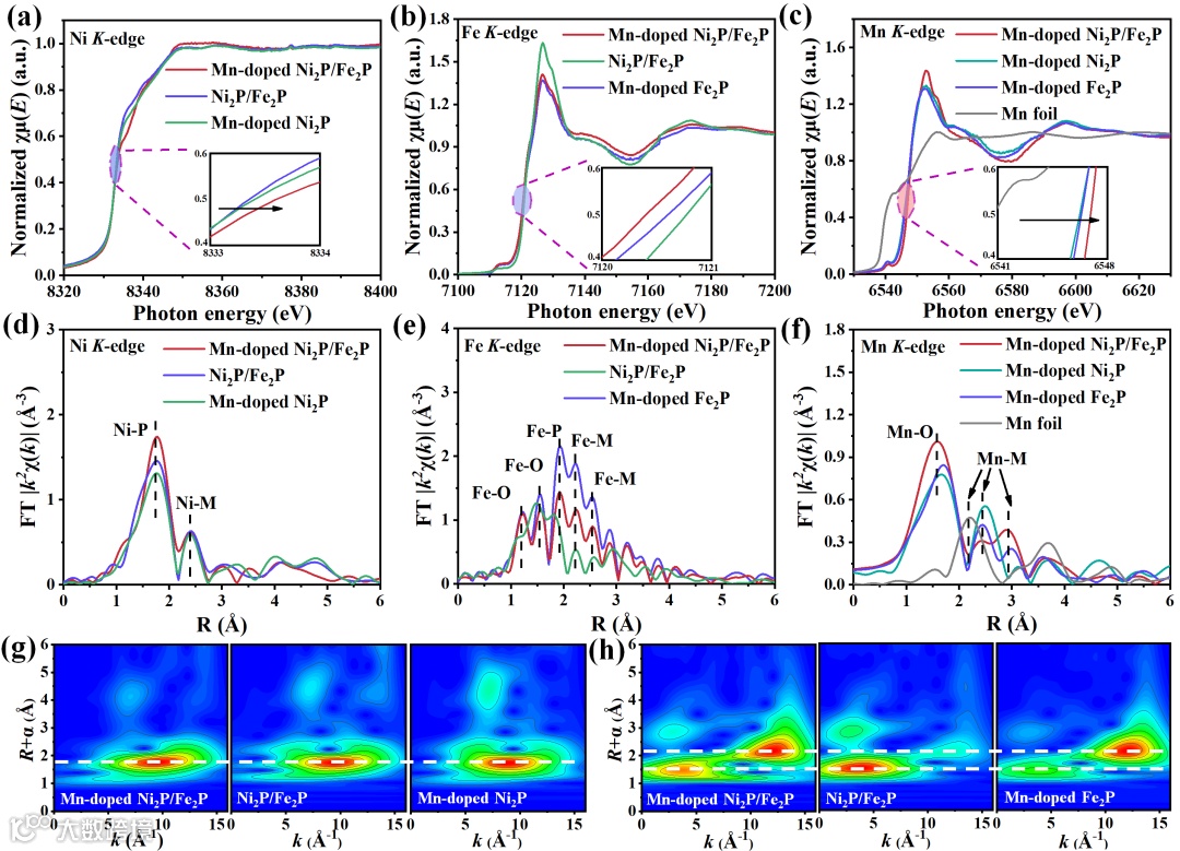 图4 Mn-doped Ni2P/Fe2P 、Ni2P/Fe2P 、Mn-doped Ni2P和Mn-doped Fe2P的XAFS Ni、Fe和Mn K-edge图谱