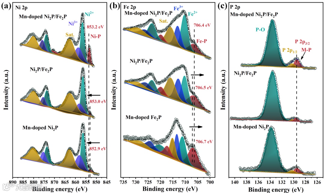 图3 Mn-doped Ni2P/Fe2P 、Ni2P/Fe2P 、Mn-doped Ni2P和Mn-doped Fe2P的XPS Ni 2p、Fe 2p和P 2p图谱