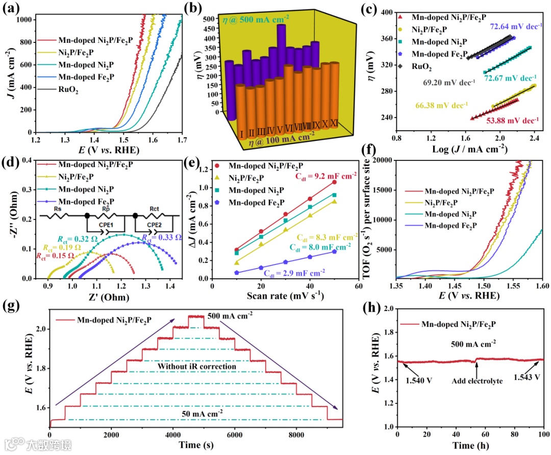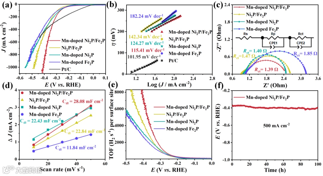 图5e和6d是催化剂的电化学活性面积图(ECSA),表明:相比Ni2P/Fe2P 、Mn-doped Ni2P和Mn-doped Fe2P,Mn-doped Ni2P/Fe2P 拥有最大的ECSA,证明Mn掺杂和Ni2P/Fe2P 异质界面能够协同增加催化剂的ECSA。