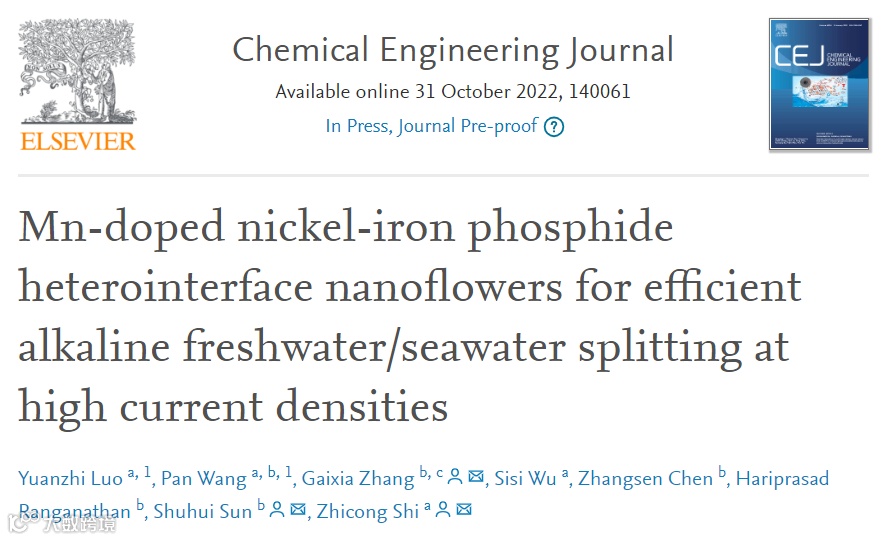 基于此,来自广东工业大学施志聪教授、加拿大高等工程技术学院张改霞教授和加拿大国立科学研究院孙书会院士合作,在国际知名期刊Chemical Engineering Journal上发表题为“Mn-doped nickel-iron phosphide heterointerface nanoflowers for efficient alkaline freshwater/seawater splitting at high current densities”的研究文章。