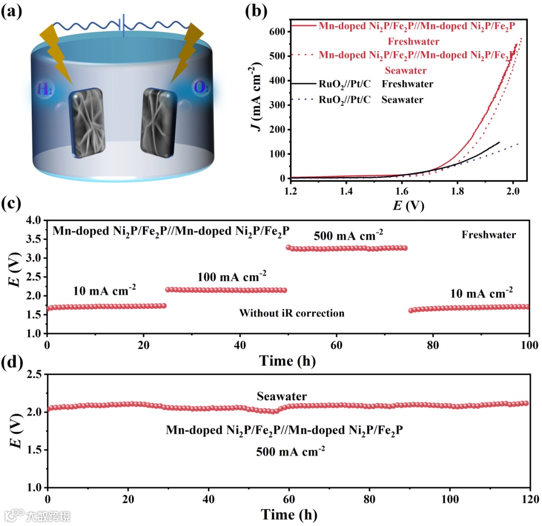 该文章报道了利用Mn掺杂和异质界面策略制备Mn掺杂的Ni-Fe磷化物纳米花,其作为双功能催化剂,能够在大电流密度(≥500 mA cm-2)电解碱性淡水/海水制氢中表现出优异活性与稳定性。