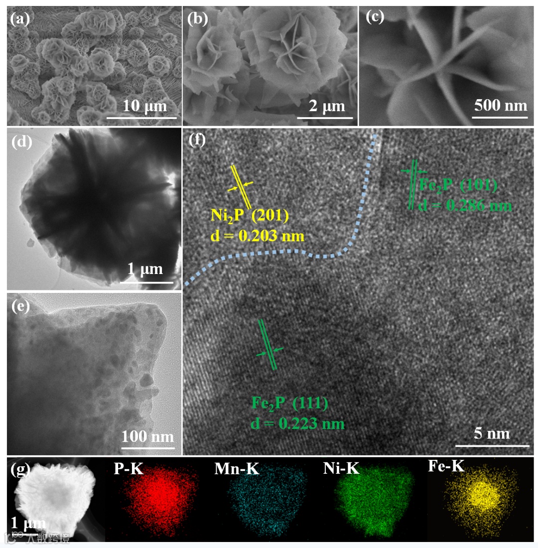图2 Mn-doped Ni2P/Fe2P 纳米花的SEM、TEM和mapping图