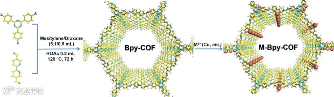Figure 1. Synthetic scheme of Bpy-COF and its post-synthetic modification to M-Bpy-COF.