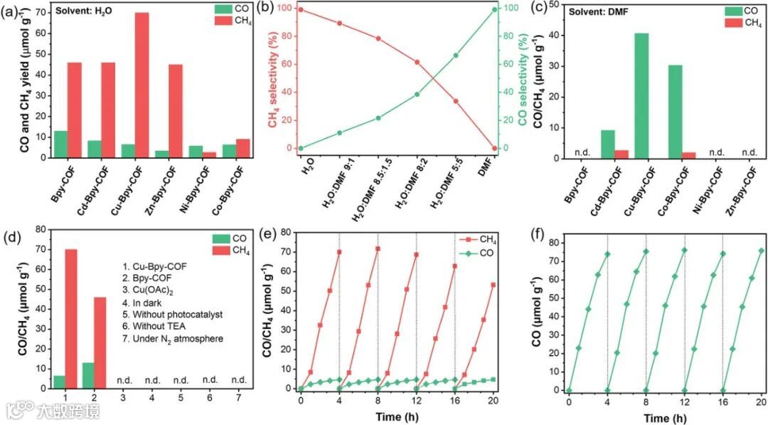 Figure 3. Catalytic performance of photocatalytic CO2 reduction. a) The yields for photocatalytic CO2 reduction to CH4 and CO over Bpy-COF and M-Bpy-COF in H2O under visible light irradiation for 4h. b) Photocatalytic selectivity of Cu-Bpy-COF in different solvent system. c) Replacing H2O using pure DMF as solvent. d) Control experiments of photocatalytic CO2 reduction performance. Cycling experiments with Cu-Bpy-COF in e) H2O and f) DMF