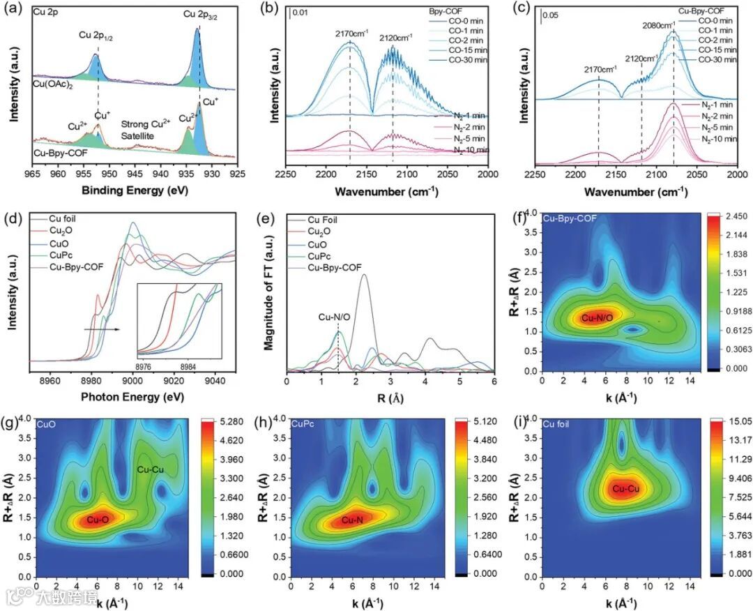 Figure 2. a) Cu 2p XPS spectra of Cu(OAc)2 and Cu-Bpy-COF. The in situ CO-DRIFTS for b) Bpy-COF and c) Cu-Bpy-COF. d) XANES and e) FT-EXAFS spectra at the Cu edge of Cu-Bpy-COF, CuPc, Cu2O, CuO, and Cu foil sample. Wavelet transform (WT) spectra of f) Cu-Bpy-COF, g) CuO, h) CuPc and i) Cu foil sample.