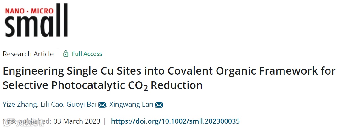 基于此,河北大学白国义教授、兰兴旺副教授团队在国际纳米领域顶级期刊Small上发表题为“Engineering Single Cu Sites into Covalent Organic Framework for Selective Photocatalytic CO2 Reduction”的研究论文。