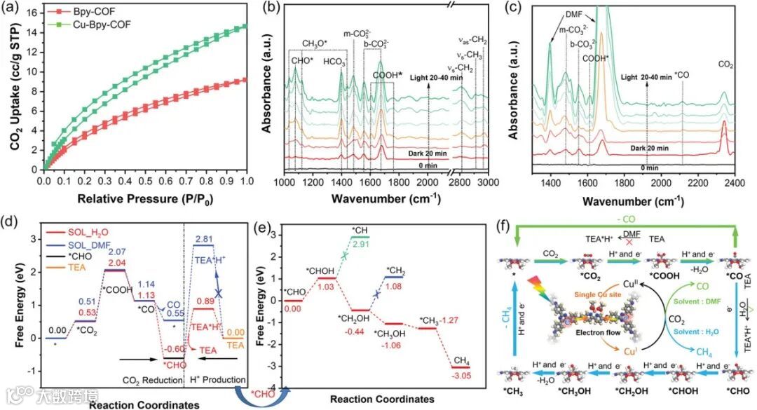 Figure 4. a) Carbon dioxide sorption isotherm profiles of Bpy-COF and Cu-Bpy-COF. The in situ DRIFTS spectra of CO2 adsorption over Cu-Bpy-COF after the introduction of b) CO2 + H2O interaction and c) CO2 + DMF interaction under the dark (0–20 min) and visible light irradiation (20–40 min). d) Free energy diagrams of CO2 photoreduction on Cu-Bpy-COF. e) The free energy diagrams of *CHO to CH4 in H2O. The “*” represents adsorption on the substrate. f) Proposed reaction mechanism for photocatalytic CO2 to CO in DMF or CH4 in H2O conversion over Cu-Bpy-COF
