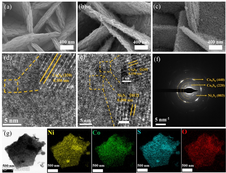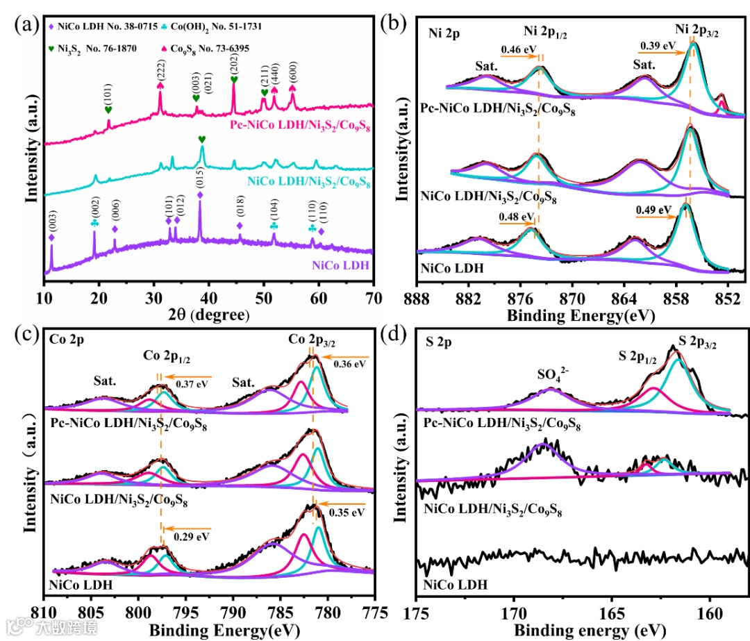 作者通过简单的水热原位转化法将Ni3S2/Co9S8异质结构与低结晶度的NiCo LDH相结合,构建了独特的分层电催化剂,研究了硫的加入量对电子结构、结晶性和电催化性能的影响。Ni3S2/Co9S8N异质结构与Pc-NiCo LDH之间的界面相互作用可以调节活性位点的电子结构,提高电荷转移速率。