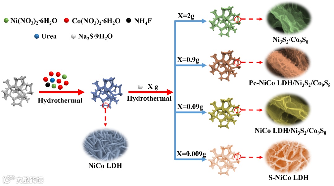 图1. Pc-NiCo LDH/Ni3S2/Co9S8合成路线.