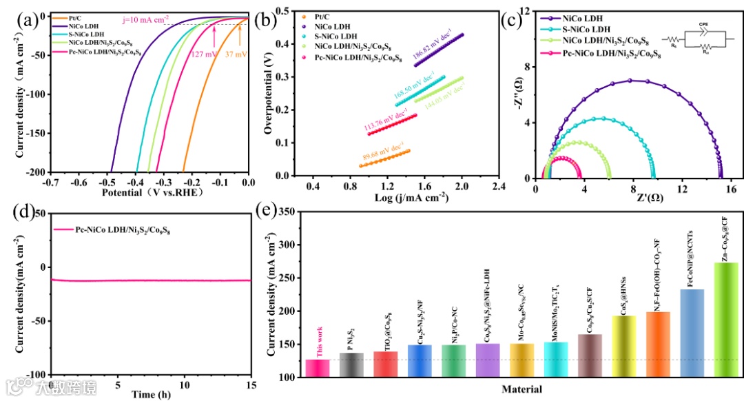 但其导电性较弱,限制了实际应用,因此通过一种简单的水热原位转化策略,成功合成Ni3S2/Co9S8异质结构嵌在低结晶度NiCo LDH纳米片阵列上的新型多相电催化剂(Pc-NiCo LDH/Ni3S2/Co9S8),为用于电催化水分解的多相复合电催化剂的设计提供了新的思路。