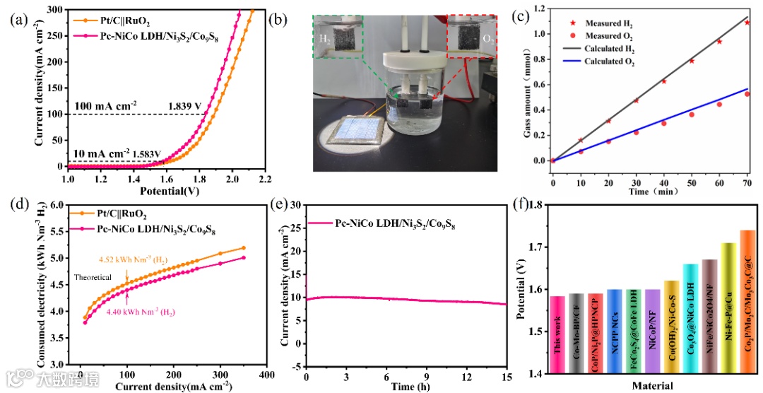 此外,独特的层次化纳米结构可以暴露更多的活性位点,增强传质过程,从而获得优异的水分解性能。Pc-NiCo LDH Ni3S2/Co9S8需要1.744V的电压实现50 mA/cm2的全解水,此时的H2和O2生产速率分别为6.4和3.1 μL s-1,表明其具有潜在的实际应用价值。这些发现不仅拓展了NiCo LDH的优化途径,而且为碱性溶液中的HER和OER开发了新型高效的电催化剂。