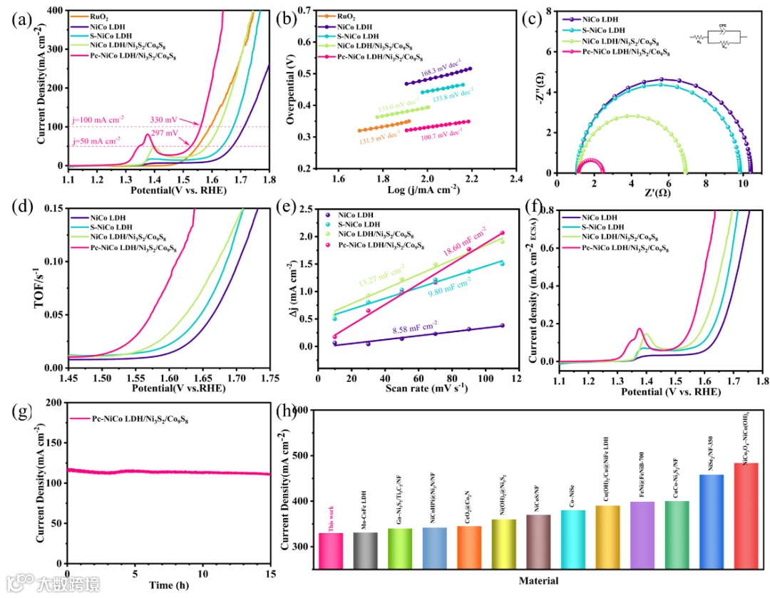 基于此,石河子大学化学化工学院陈龙副教授团队发表了研究性文章,该论文设计了一种Ni3S2/Co9S8异质结构嵌在低结晶度NiCo LDH纳米片阵列上的新型多相电催化剂,并将其应用于碱性条件OER和HER中,其对应的过电位分别为η100=330 mV、η10=127 mV,全解水达到10mA/cm2的电流密度需要1.583V的电压。