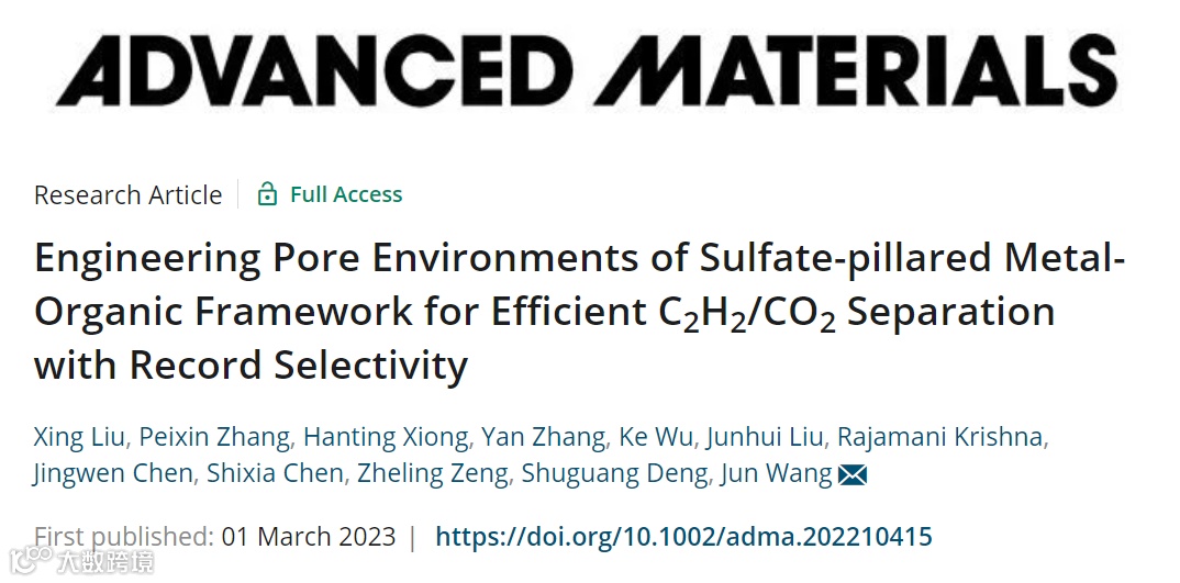 基于此,王珺教授课题组基于前期的工作积累(J. Am. Chem. Soc., 2020, 142, 9744;Science Advances, 2022, 8, eabn9231;Nat. Commun, 2022, 13, 200;Nat. Commun, 2022, 13, 5515;AIChE Journal, 2023. e17937等);在期刊Advanced Materials (IF: 32.086) 上发表了题为“Engineering Pore Environments of Sulfate-pillared Metal-Organic Framework for Efficient C2H2/CO2 Separation with Record Selectivity”的研究论文。