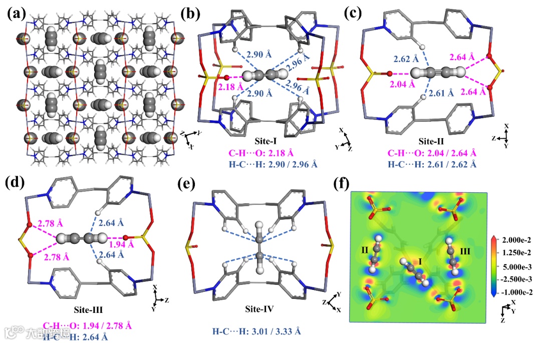 模拟研究表明C2H2在框架中有着致密的堆积并显示了四个明显的吸附位置 (图3)。其中,位点Ⅰ-Ⅲ上的C2H2都通过C-H···O键被硫酸根上的氧原子牢牢捕获。同时由于C2H2的致密堆积,在孔隙中观察到了客体之间的相互作用。而框架只能与CO2形成弱的O-C···H范德华相互作用,且由于电性排斥没有发现的CO2有效堆积。明显的主客体电荷转移进一步表明了SOFOUR-TEPE-Zn对C2H2的选择性高效吸附。