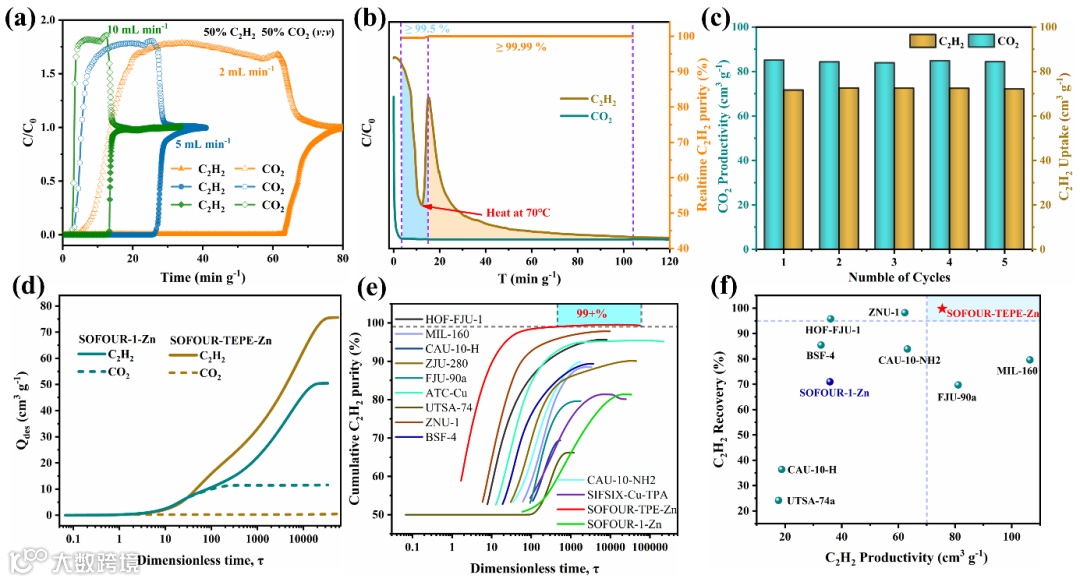 动态突破实验进一步证实了其应用的可行性和在不同流量下的良好循环性能。在不同的流量下进行C2H2/CO2 (50/50,v/v) 混合气体动态突破实验,均未发现分离时间的明显降低,表现出良好的循环性能。在解吸循环中,通过分级吹扫和温和加热,可回收纯度99.5 %的C2H2 (60.1 cm3 g-1)或纯度99.99 % 的C2H2 (33.2 cm3 g-1)。模拟变压吸附过程表明,逆流吹扫过程可生产纯度高达99.5+ %的 C2H2 (75.5 cm3 g-1),气体回收率为99.82 %。
