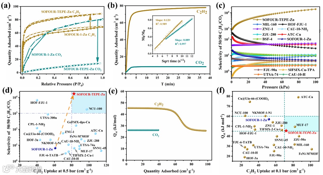 图2. SOFOUR-TEPE-Zn的气体吸附行为及选择性和吸附热对比。