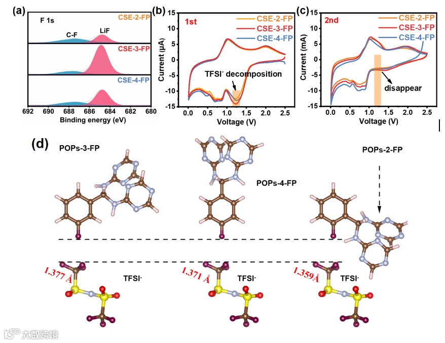 本研究通过XPS确认了不同电解质的SEI层中具有不同的氟化锂含量,表明已经成功构建出不同LiF含量的SEI。LiF的形成和TFSI-分解紧密相关,为了进一步研究LiF含量的差异的来源,利用CV测试以及理论计算研究TFSI-的分解情况,结果表明,F在POPs苯环上的不同排列导致POPs对催化TFSI-分解能力的不同,辅以的理论计算则更好得解释了不同的催化分解能力源于不同的F排列将电解质中阴离子的C-F键拉伸到不同的长度,使得不同电解质中TFSI-分解的难易程度不一致,进而导致SEI中氟化锂的浓度不同。