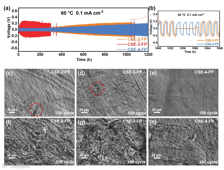 图2. (a)Li//CSE//Li对称电池在电流密度为0.1 mA cm−2、面积容量为0.1mAhcm−2时在各种电解质中的循环性能。(b)Li对称电池的放大电压曲线:1048-1068 h。(c)CSE-2-FP100循环,电流密度为0.1mAh cm-1;(d) CSE-3-FP 100循环循环后的锂表面SEM;(e) CSE-4-FP 100循环;(f) CSE-2-FP 350循环;(g) CSE-3-FP 350循环;(h) CSE-4-FP 350循环。