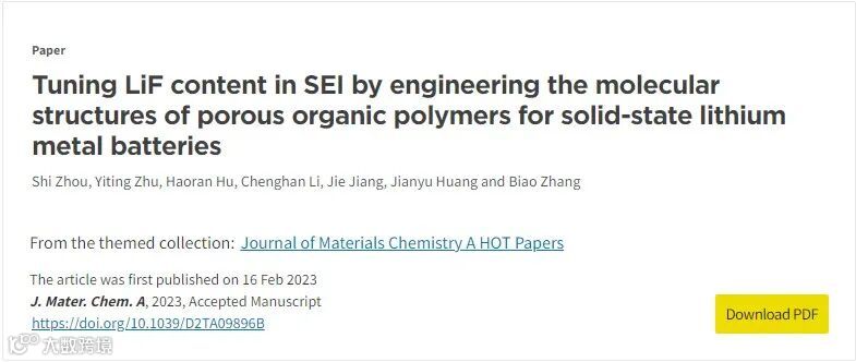 基于此,湘潭大学的姜杰副教授,张彪副教授,黄建宇教授在“Journal of Materials Chemistry A” 期刊上发表题为“Tuning LiF content in SEI by engineering the molecular structures of porous organic polymers for solid-state lithium metal batteries”的文章,并入选Hot Papers主题集。