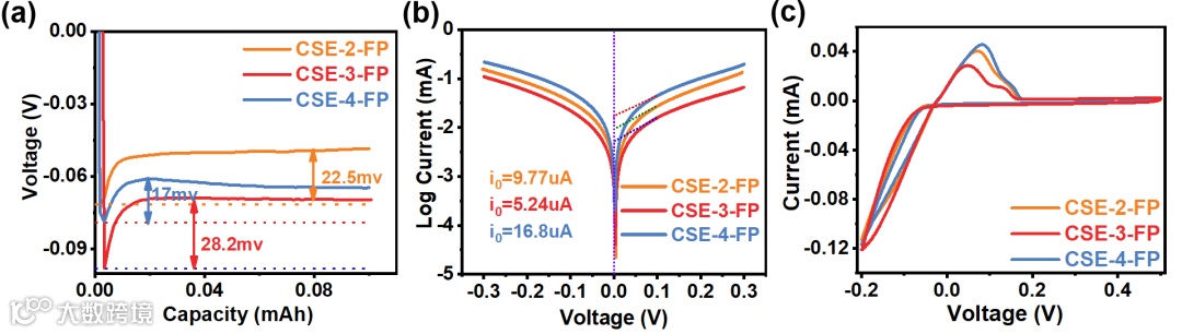图3. (a)Li/CSE-X-FP/Li对称电池的成核过电位。Li/CSE-X-FP//Li对称电池的Li镀/剥离的(b) Tafel图。(c)在1 mV-1时,−0.2V和2.4 V之间的CV曲线。