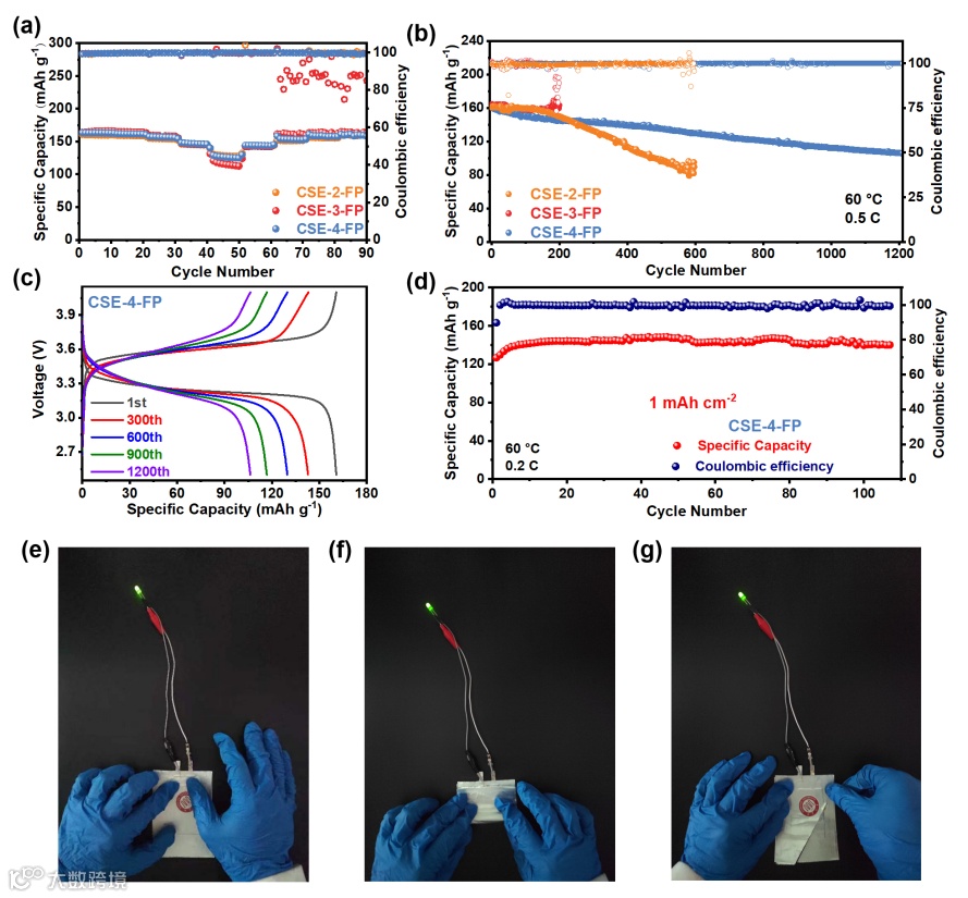 图4. (a)LFP//CSE//Li电池的速率性能。(b)LFP//CSE//Li电池的长期循环。(c).LFP//CSE-4-FP//Li电池的电压容量分布图。(d)LFP//CSE-4-FP//Li电池在0.2C下的循环稳定性。LFP的质量负荷为1 mAh cm-2。LFP//CSE-4-FP//Li袋电池(e)点亮LED灯泡,(f)弯曲和(g)切割。