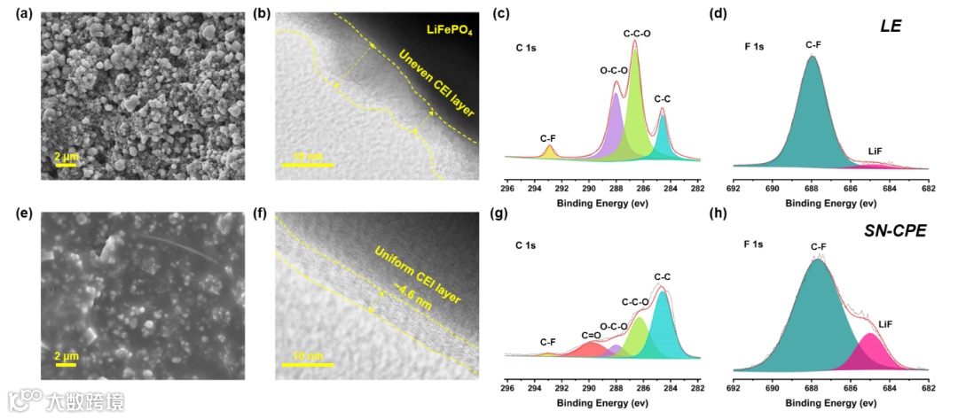 此外,我们还对循环后的正极表面进行了进一步分析,以揭示CEI层的化学性质。经过原位聚合后,活性物质颗粒表面被聚合物完全覆盖,这表明原位聚合反应实现了电极/电解质之间的紧密接触。通过TEM,我们观察到薄而均匀的CEI层在活性物质与SN-CPE电解质界面形成,表明界面副反应不严重和无过渡金属离子的溶出。XPS分析表明,与LFP/LE界面相比,LFP/SN-CPE界面存在更多的LiF,这可以有效抑制聚合物电解质在高电位下的分解。