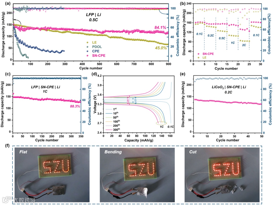 SN-CPE在LiFePO4/Li准固态电池中表现出良好的循环性能,在0.5C下循环900次后,容量保持率达到84.1%,相比之下,以DOL为溶剂的液态LiFePO4/Li电池只保留初始容量的45.0%,因此,由液态到准固态的原位聚合手段可以有效提高电解质在长循环过程中的稳定性。本文还研究了SN-CPE在高温(80°C)下、或匹配LiCoO2正极时的循环性能,此外,基于SN-CPE的软包电池在承受弯折、剪切后仍能正常工作。这些都表明SN-CPE具有良好的安全性和在极端条件下的应用潜力。